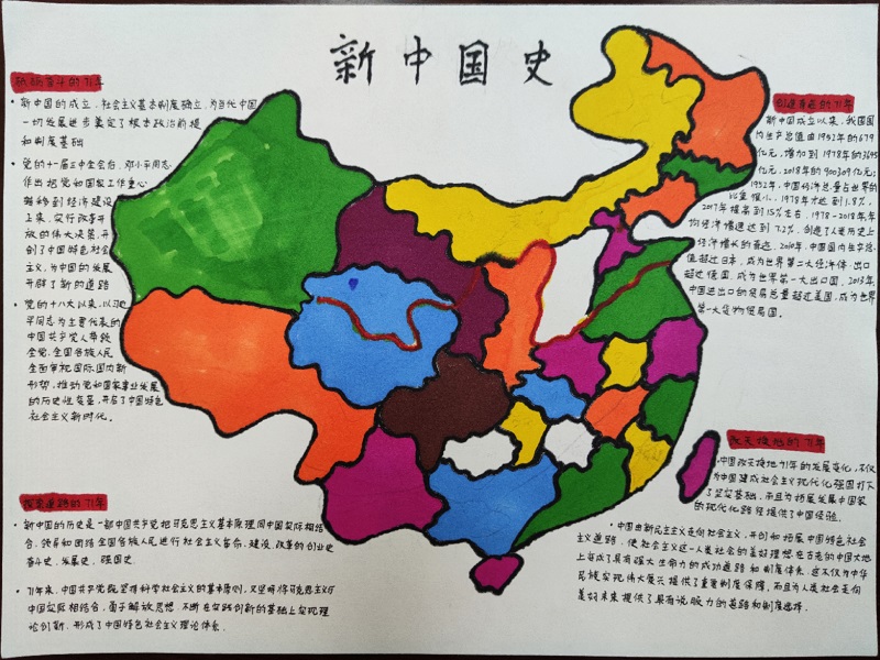 赵磊、管京敏和张雯博组展示的手抄报主题为新中国史。赵磊表示,学习新中国史,有利于引导党员干部、广大群众和青少年,热爱祖国,自觉维护国家和民族的尊严,因此将中国地图放在手抄报的中间,象征着中华民族伟大复兴的光明前景,四周的四个板块分别象征新中国成立以来的重大历史方位变化、改革开放取得的惊人成就、社会主义社会道路的探索以及对世界的积极影响。