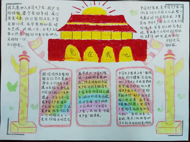 姚嘉欣、谢俊红和孙梦佳组展示的手抄报主题为党史。谢俊红首先介绍了手抄报设计寓意,她说,天安门寓意着强有力的国家政权,华表象征着中国人民从此站起来了。随后她从理论基础、阶级基础、组织基础三方面介绍了中国共产党的诞生。她表示,中国共产党历史是从1921年7月1日成立以来的整个过程的全部历史,主要包括中国共产党历次代表大会的情况、党章的不断完善过程,党在不同时期的组织建设和发展状况,是我党领导全国各族人民进行革命和建设的发展历程和全部史实的记载。