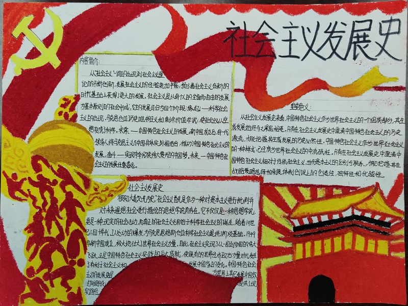 沈彦兵、李开组展示的手抄报主题为社会主义发展史。“四史”中社会主义发展史是时间跨度最长的。学习社会主义发展史是为了从源头上弄清楚社会主义从哪里来,中国特色社会主义从哪里来。通过对社会主义五百年历程的梳理与回顾,同学们对于中国是怎样历史地选择了社会主义道路、是怎样独立自主走自己的路的、是怎样开创和发展了中国特色社会主义的有了更深入的理解。