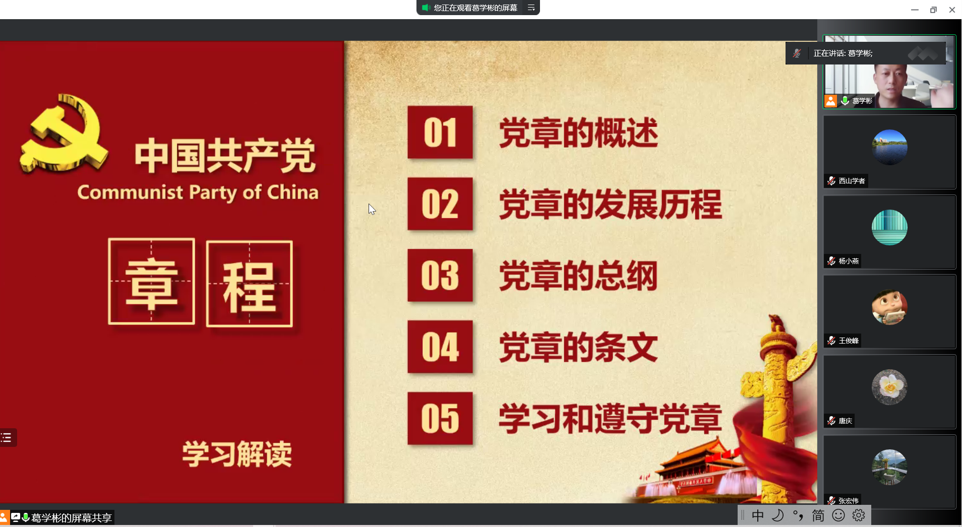 党支部书记葛学彬以“学习《中国共产党章程》”为题讲授专题党课。集体学习按照习近平总书记关于《认真学习党章,严格遵守党章》的要求,对党章进行了解读。党的十九大通过的《中国共产党章程》共计约20000字,包括总纲和11章,共计55条内容。专题党课从如下方面展开:一是党章的概述。解读了党章的概念、党章的功能和定位、党章的基本架构、党章的主要内容。二是党章的发展历程。解读了党章的制定修改和四大体系、党的第一个纲领、第一部党章、党章的五大里程碑。三是党章的总纲。总纲的概述、党的性质、党的行动指南、主要成就和新时期的历史任务、社会主义初级阶段、党领导各项工作的基本方针等方面。四是党章的条文。主要解读了党员和党的干部、党的组织制度、党的组织体系、党的纪律和纪律检察机关、党和共产主义青年团的关系、党旗党徽等。