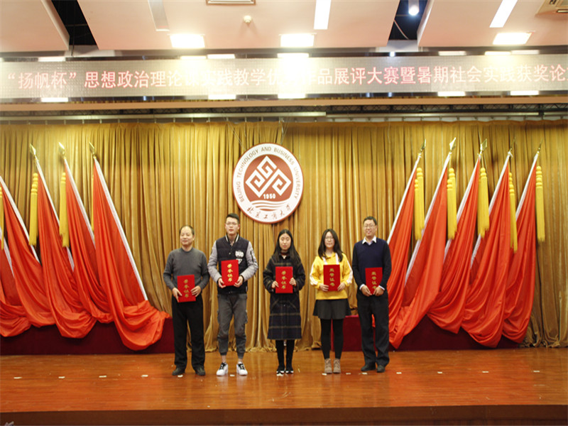 出席大赛的领导和教师代表为本次大赛的获奖小组员工代表和2018年暑期思想政治理论课社会实践特等奖、一二三等奖的小组员工代表颁奖。