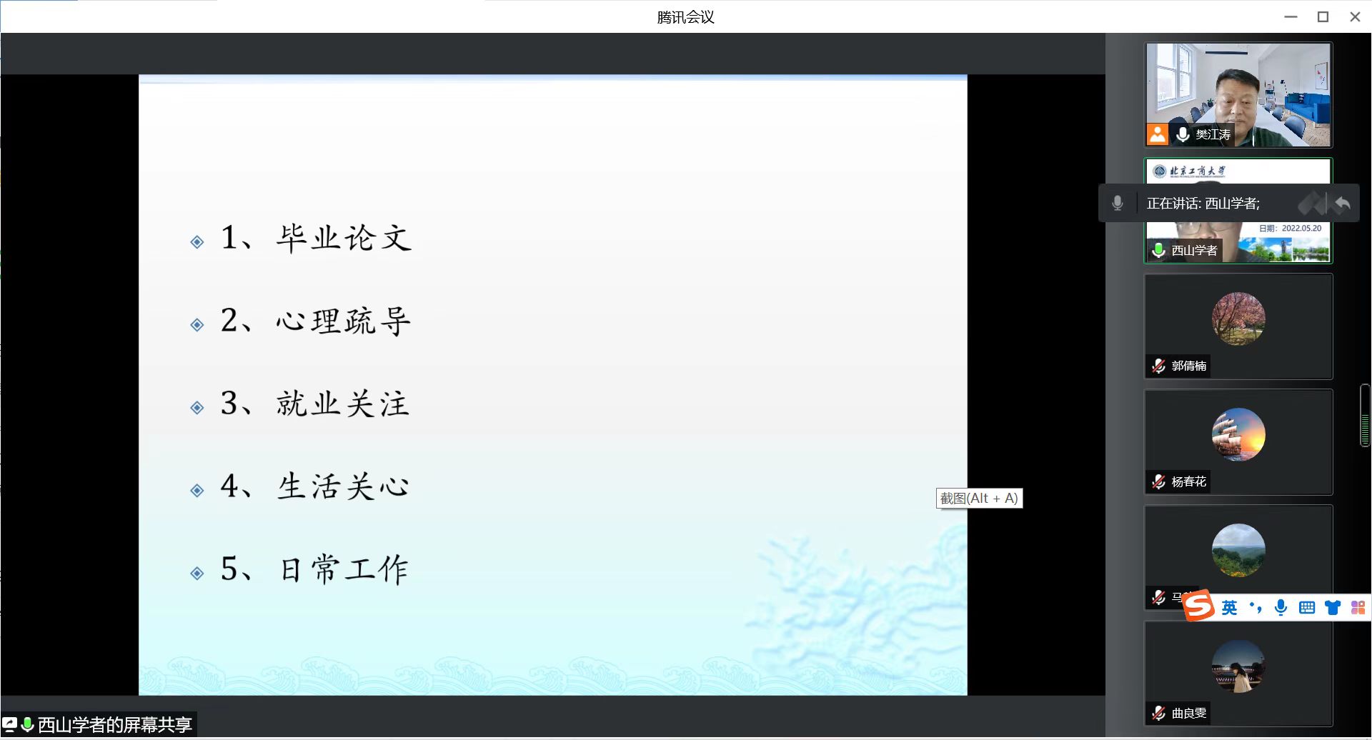副经理姚洪越通过分析本届毕业生三年来的表现,指出导师常态化指导关怀的重要性,导师既要指导学业,也要对研究生的心理健康和正常生活负责,要随时掌握论文和就业进展,及时进行正面引导,第一时间反馈问题,以高度的责任意识和底线思维培养研究生,他强调在当前员工居家学习时期,导师要针对性地给予员工关心关怀、温暖温情,做到精益求精。