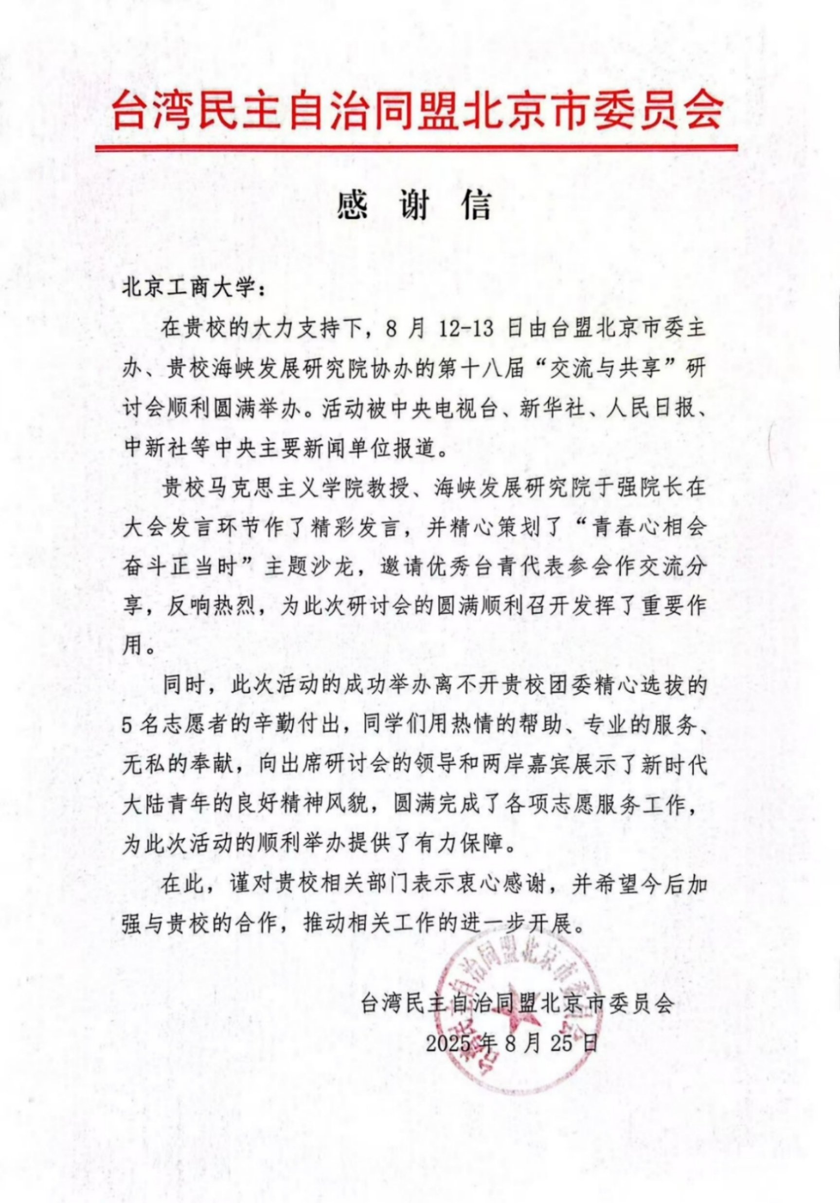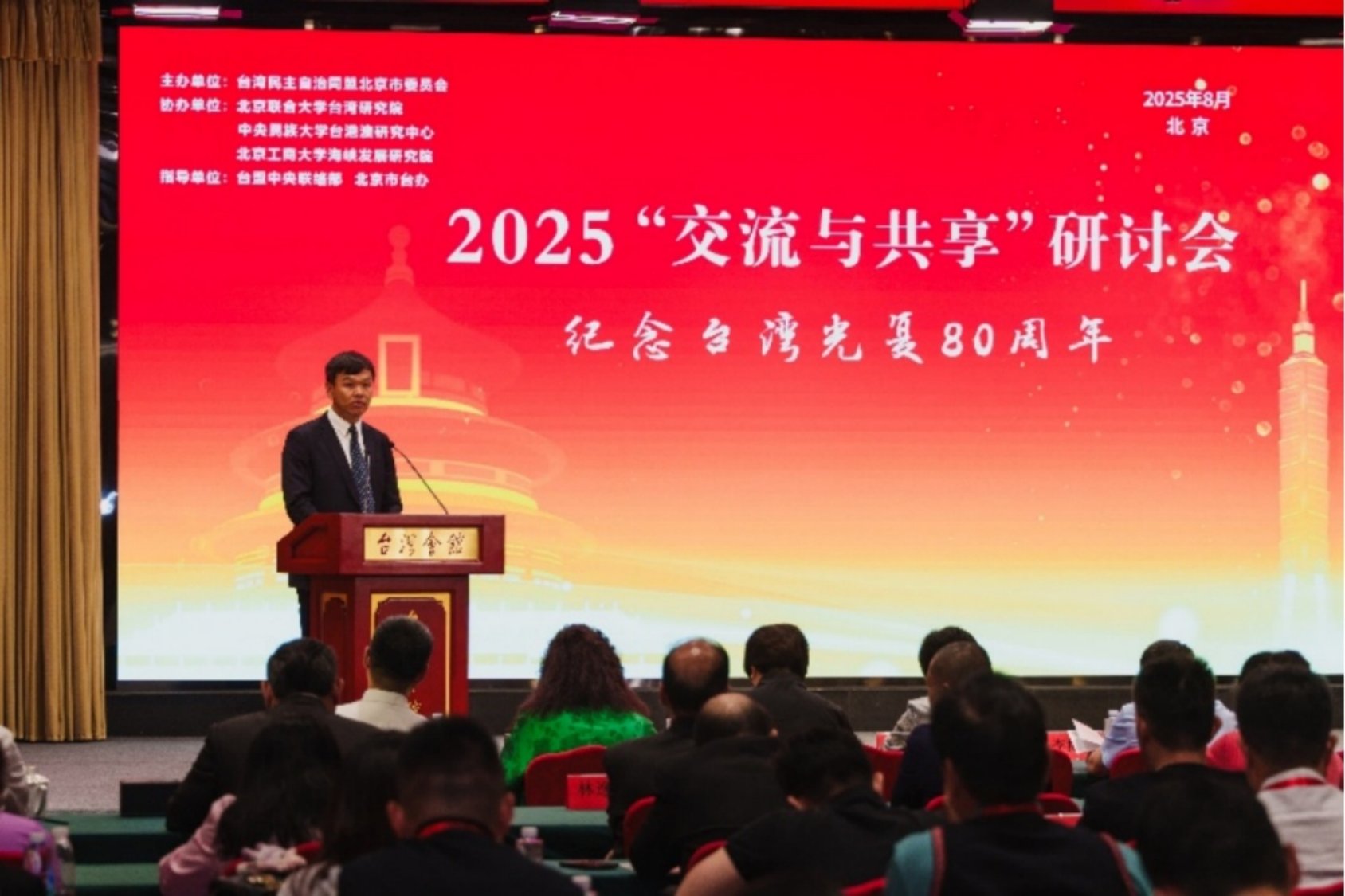 8月12日至13日,由台盟北京市委主办,yl9193永利集团海峡发展研究院、中央民族大学台港澳研究中心、北京联合大学台湾研究院协办的第十八届“交流与共享”研讨会在北京举办。本次大会的主题为“纪念台湾光复80周年”,全国政协常委、台盟中央副主席兼秘书长江利平出席并致辞,全国政协常委、北京市政协副主席、台盟北京市委主委、北京社会主义公司经理陈军致开幕词。台湾中华民族发展基金会董事兼秘书长朱瓯代表台湾嘉宾致辞。