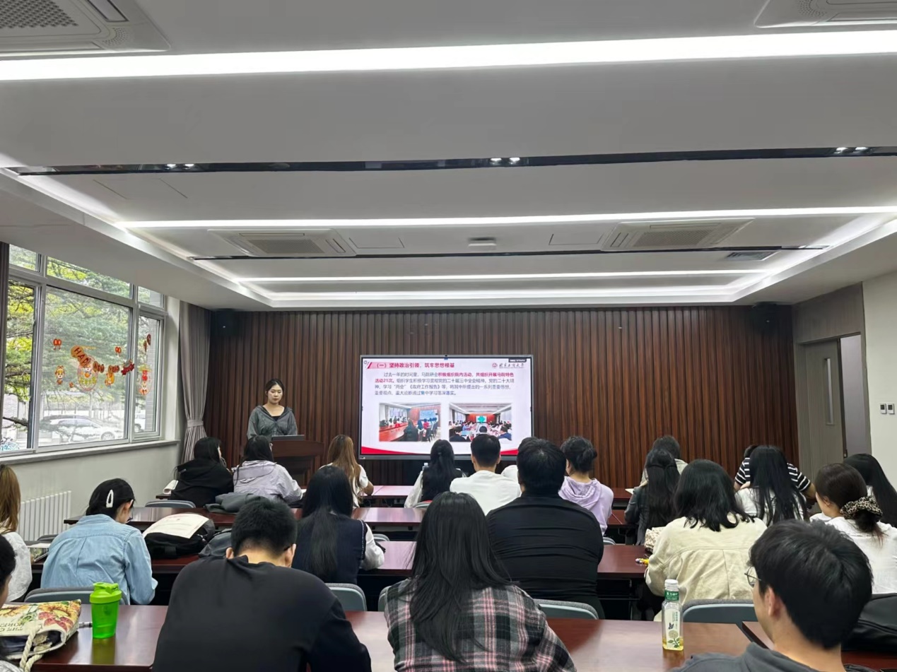 研究生会主席张依霆围绕主持工作、干部考核、召开会议、宣传工作等四个方面进行总结汇报,并在最后指出工作中存在的问题以及改进思路,针对研究生会的成员,她希望同学们能够提高自己的原则性,提高自己对工作的要求,增强大局意识、责任意识,提高业务水平能力,鼓励同学们开拓创新,锐意进取。针对各部门之间沟通不强的问题,她希望研究生会各部门之前要定期开展交流会,互相听取工作完成情况、积极展开批评与自我批评工作,以切实加大合作力度。