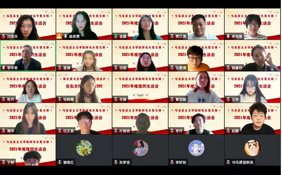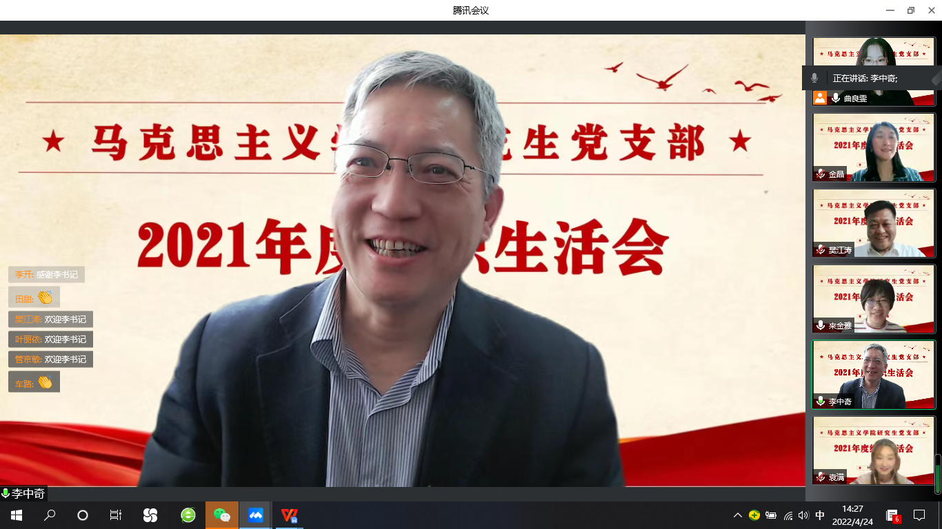 李中奇副书记就开好组织生活会的目的、意义、态度、程序和要求进行了详细指导。他指出,组织生活会是党内政治生活的一项重要制度,也是党内监督的一种重要形式,是密切党内同志间关系的重要平台,是同志间相互提醒帮助的重要平台,是把党的三大优良作风落实到具体工作生活中的重要平台,是严肃党内政治生活的重要平台。开好组织生活会,认真开展批评和自我批评,是正确认识自己,勇于修正错误,严守党风党纪,加强党性锻炼的过程。他对研究生党支部工作给与了具体指导,要求党支部担负起教育党员、管理党员、监督党员和组织群众、宣传群众、凝聚群众、服务群众的职责,发挥好战斗堡垒作用,他希望研究生党支部全体党员发挥先锋模范作用,直面问题、勇于担当,打造更具凝聚力和向心力的党支部。最后,李中奇副书记希望这次的组织生活会是一次严肃的、认真的、成功的会议,并强调同学们要服从防疫大局,安排好居家学习生活,以优良表现和优异成绩展现先锋模范形象。