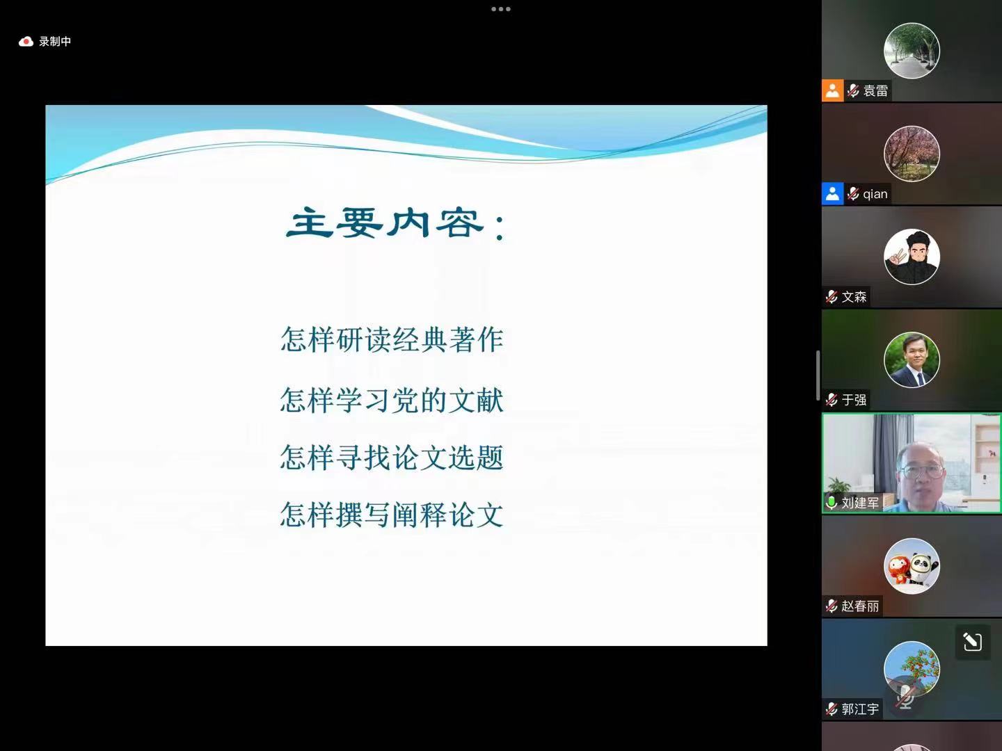 7月13日上午,在专家讲座环节,首先由中国人民大学刘建军教授以《怎样研读经典著作和党的文献》为题向大家进行了专题介绍,主要围绕怎样研读经典著作、怎样学习党的文献、怎样从经典中寻找论文题目、怎样从讲话中寻找题目以及怎样撰写阐释论文五部分展开论述。刘建军教授耐心细致生动的讲解帮助营员们进一步掌握论文写作思路与技巧,为日后深耕学习打下了坚实的基础。