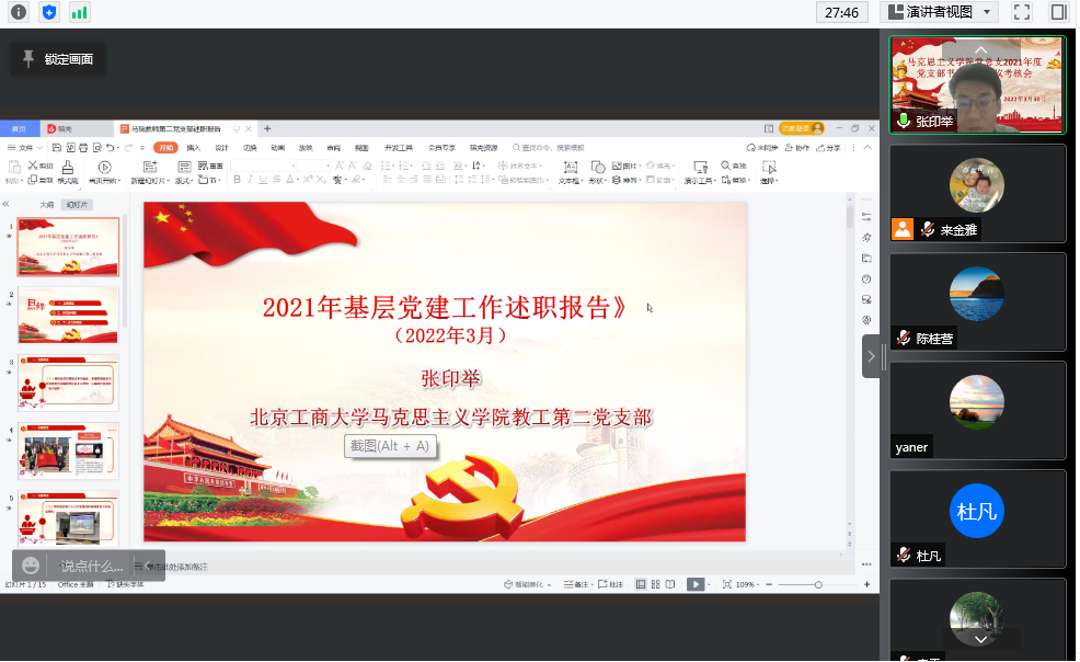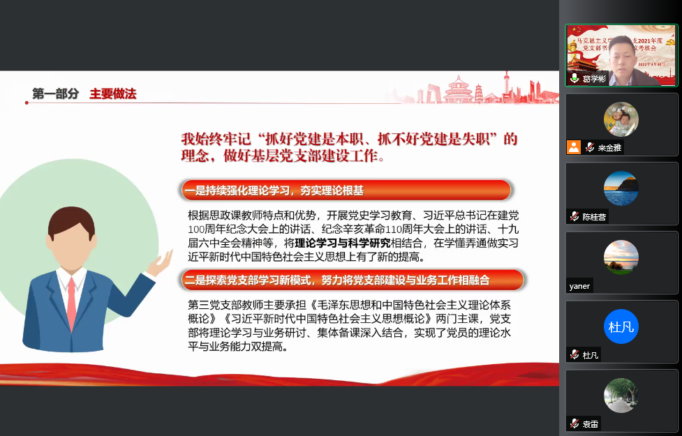 3月30号上午,根据公司《中共yl9193永利集团委员2021年度基层党建述职评议考核工作实施方案》文件精神和疫情防控工作的需要,公司党总支在线上召开了2021年度党支部书记述职评议考核会。公司党总支委员、专职组织员、师生党支部书记参加会议,会议由公司党总支书记任金晶主持。组织部陈桂营老师列席会议。