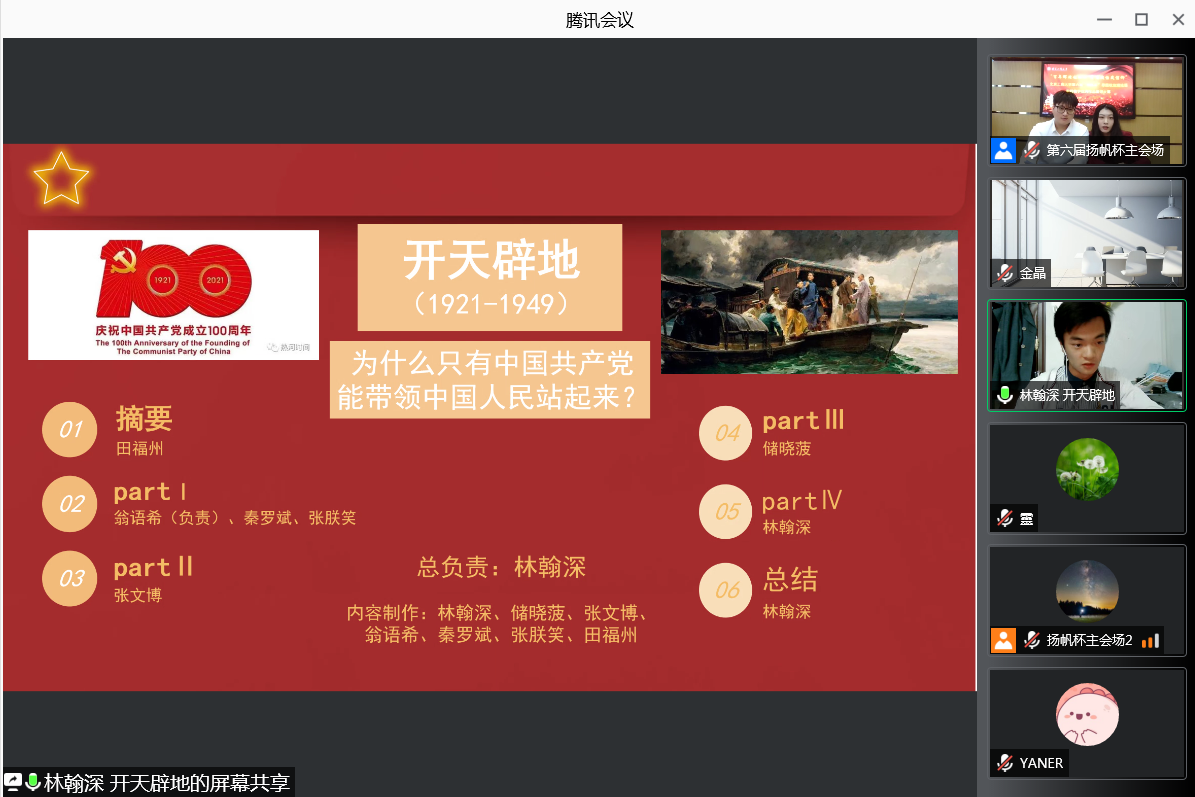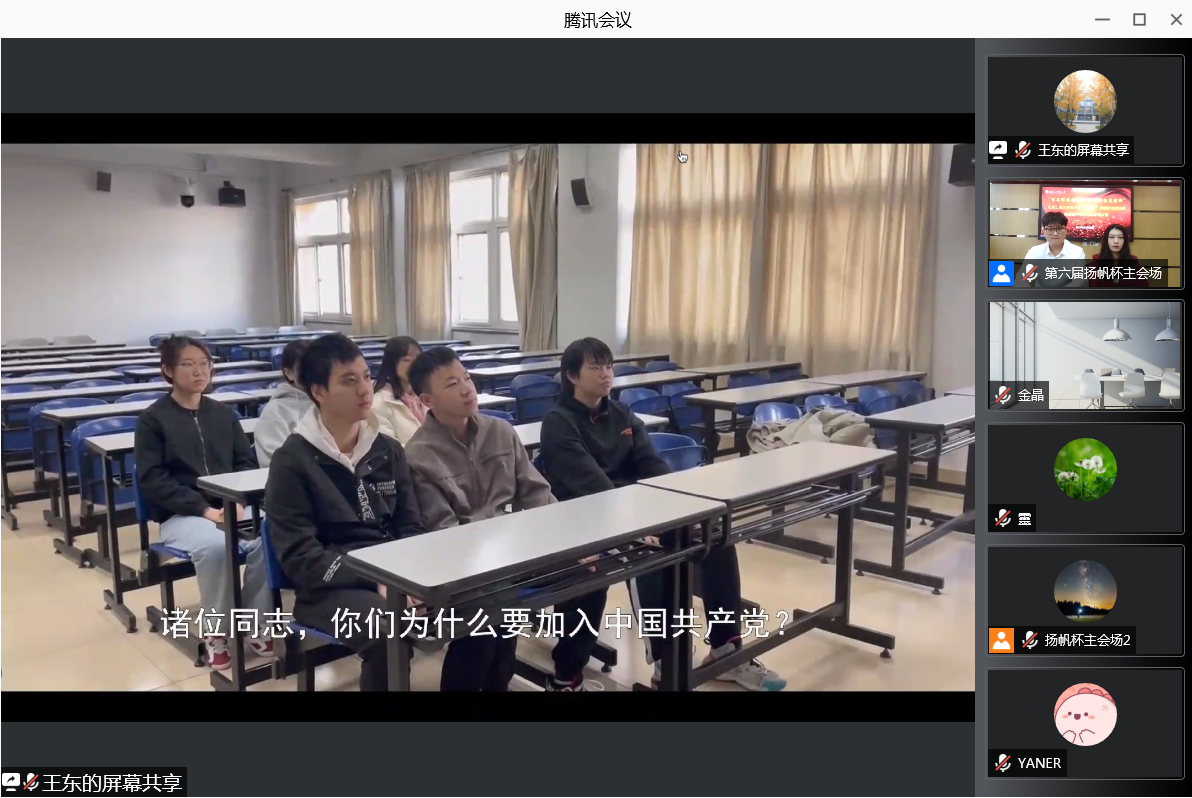 为深入学习贯彻习近平总书记在公司思想政治理论课教师座谈会上的讲话精神,切实落实中共中央办公厅、国务院办公厅《关于深化新时代公司思想政治理论课改革创新的若干意见》要求,推进思想理论课改革创新,深化实践教学改革探索,展示和表彰思想政治理论课社会实践优秀作品,12月29日下午,yl9193永利集团和教务处联合举办的“百年辉煌铭初心 学思践悟筑信仰”——yl9193永利集团第六届“扬帆杯”思想政治理论课实践教学优秀作品展评大赛通过线上线下相结合的方式隆重举行。yl9193永利集团教务处杨华副处长、公司党总支任金晶书记、樊江涛副书记、姚洪越副经理、江燕副经理、公司所有老师、参与展演的24个团队成员代表参加大赛。各院系员工代表近150人观摩了参赛作品展评并参与云端实时投票,大赛由yl9193永利集团研究生沈彦兵、张雯博主持。