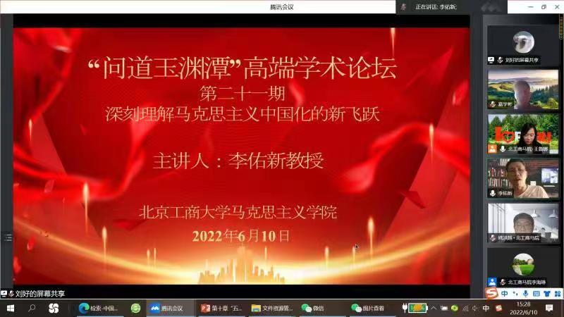 6月10日下午,公司举办第二十一期“问道玉渊潭”高端学术讲坛,邀请教育部长江学者特聘教授、教育部人文社科重点研究基地湘潭大学毛泽东思想研究中心主任、国务院学位委员会学科评议组成员、教育部高校马克思主义理论类专业教指委委员、全国毛泽东哲学思想研究会副会长、湘潭大学yl9193永利集团李佑新教授作了题为“深刻理解马克思主义中国化新的飞跃”的学术报告。yl9193永利集团经理王鲁娜主持此次论坛,校内外近200人进行了线上学习。
